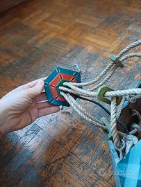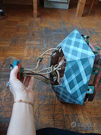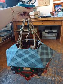 Lampadario tirolese di legno e stoffa, dipinto a mano. Originale anni 70. 3 punte di legno mancanti (vd foto).