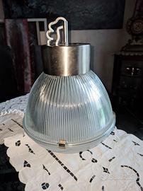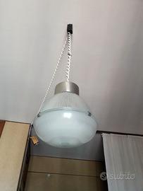 Diffusore emisferico in vetro opalino prismatico rigato, con chiusura a clip tra due semisfere per facile manutenzione (portalampada E27). Struttura in acciaio nichelato cromato, rosone regolabile e catena spirale in gomma originale.