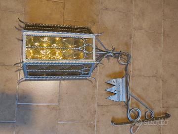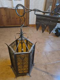 lampadario / appliche. in ferro battuto colore canna di fucile con vetri ambrati. possibilità di montaggio a cento volta o a. muro