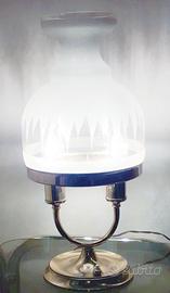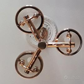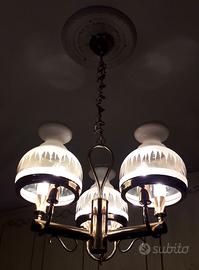 Lampadario tre luci (e abat-jour abbinata) con struttura in ottone e vetreria. Vintage Design. Misure: Larghezza max lampadario: 47 cm. ; Lunghezza max lampadario: 36 cm. ; Altezza catena (regolabile): 50 cm.