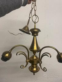 Lampadario con tre punti luce in ottime condizioni (attacco piccolo, e14) senza lampadine ( il primo nelle foto). In regalo ( se desiderato ) il secondo lampadario sempre con tre punti luce ma purtroppo senza paralume di vetro in quanto rotte e sarebbe da restaurare comunque; questo ha attacco lampadine grande e27 (ultime foto).