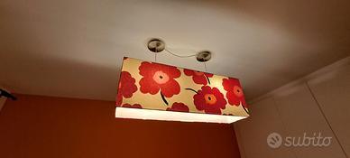 Vendo lampadario con due lampadine E27, dimensioni 100x25x35 cm, perfette condizioni, materiale metallo e tessuto a tinta floreale.