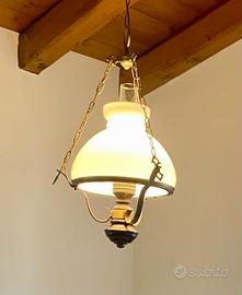 VENDO lampadario ideale per cucina/sala da pranzo/taverna come da foto. Campana in vetro bianco, struttura in ottone e legno.