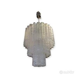 Lampadario a sospensione in vetro di Murano prodotto da Venini made in Italy anni sessanta. Composto da una struttura metallica e da 47 vetri vetro con una sezione che richiama il cilindro e il triangolo.