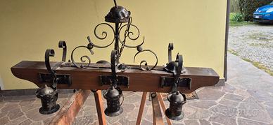 lampadario artigianale fatto a mano, ideale x taverne in ferro battuto e legno