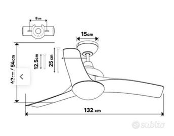 Lampadario con ventilatore dotato di telecomando, colore grigio chiaro, doppio punto luce, dimensioni in foto.