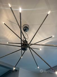 Lampadario in acciaio satinato 14 punti luce. Ingombro circa 70 centimetri. Attualmente posizionato in cucina.