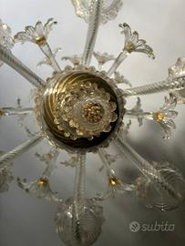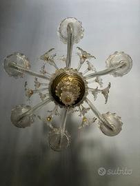 Vendesi lampadario in vetro di Murano e polvere d’oro zecchino, con 6 punti luce e 18 fiori decorativi.
