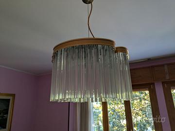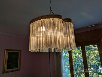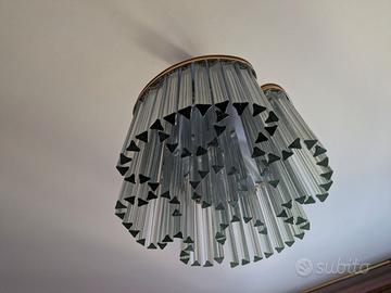 Questo è un lampadario a sospensione italiano Mid-Century Modern in vetro di Murano, disegnato da Pia Guidetti Crippa per Lumi Milano negli anni '60 o '70, caratterizzato da prismi di vetro a triedro e una struttura in ottone dorato.