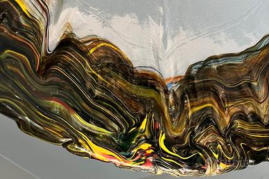 Design: Il paralume presenta una forma a cupola irregolare e ondulata, realizzata con la tecnica artigianale dello "sbruffo", che crea un affascinante effetto marmorizzato o "a onde" nei toni del giallo, rosso, verde blu, ambra/oro.