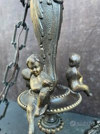 "Elegante lampadario vintage a sospensione in bronzo massiccio, finemente lavorato a mano. Il corpo centrale è decorato con tre figure di putti (cherubini) in rilievo, tipiche dello stile Neoclassico/Luigi XVI. Struttura: 5 bracci curvi con decorazioni fogliacee. Dettagli: Portalampade a forma di candela (attacco E14 piccolo). Materiale: Bronzo con patina scura originale del tempo. Condizioni: Ottimo stato estetico come da foto. Struttura solida comprensiva di catena e rosone originale. Stile: Ideale per arredamenti classici, studi o saloni d'epoca. Disponibile per il ritiro a mano o spedizione tracciata con imballaggio accurato."