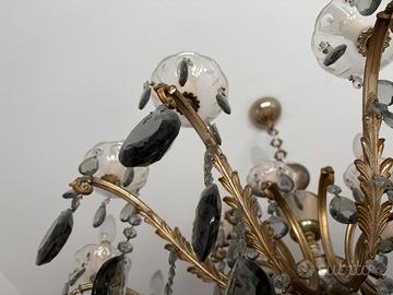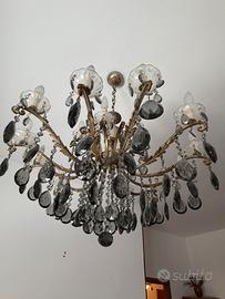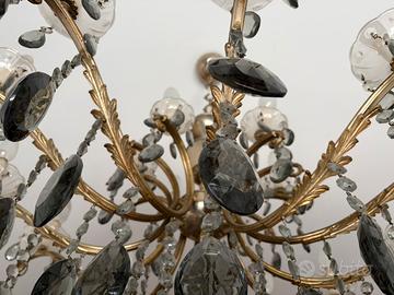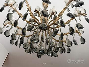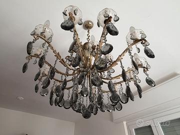 L'oggetto mostrato è un lampadario vintage a 12 luci realizzato in ottone e decorato con grandi pendagli in cristallo fumé a forma di goccia. Questo stile di illuminazione è tipico della produzione italiana tra gli anni '30 e '50. Materiali: Struttura portante in ottone dorato con bracci ricurvi e bacinelle (piattini sottolampada) in vetro lavorato. Pendagli: Caratterizzato da cristalli sfaccettati di grandi dimensioni in una tonalità "fumé" (grigio fumo), che conferiscono un aspetto elegante e retrò. Configurazione: Modello a 12 bracci disposti su un unico livello o a corona, progettato per lampadine con attacco E14 (piccolo).