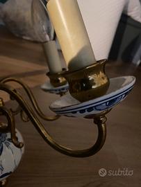 Vendo elegante lampadario vintage a 5 luci in ottone con dettagli in ceramica bianca decorata blu, stile rustico / arte povera.