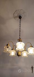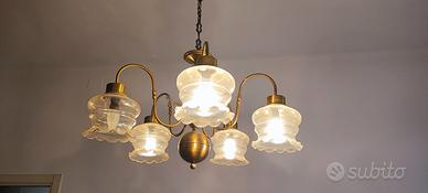Vendo elegante lampadario vintage a 5 luci, in ottone anticato con paralumi in vetro trasparente lavorato.