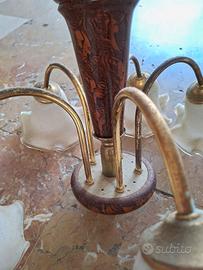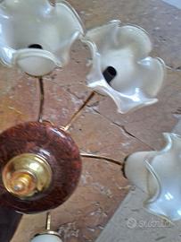Lampadario Vintage 5 Luci Stile Classico - Ottone e Paralumi in Vetro Opolino lampadario a soffitto vintage, risalente probabilmente agli anni '70/'80, perfetto per chi ama lo stile classico, retrò o vuole dare un tocco d'epoca a un ambiente moderno. Il lampadario è a 5 luci, con una struttura robusta e dettagli curati. Caratteristiche principali: Struttura: Realizzata in ottone lucido con inserti decorativi in legno o bachelite (effetto radica/marmorizzato marrone scuro), che donano calore al design. Paralumi: Include i 5 paralumi originali in vetro opolino satinato bianco, con il caratteristico bordo a balza/arricciato, molto decorativi e in grado di diffondere una luce calda e soffusa. Bracci: Eleganti bracci curvi in ottone. Sospensione: Dotato di rosone a soffitto e gancio per l'installazione. Stato del prodotto: Il lampadario è in ottime condizioni generali, perfettamente integro. I vetri sono tutti originali e privi di scheggiature. L'ottone presenta la sua patina naturale, che ne attesta l'originalità, ma può essere lucidato se si preferisce una finitura più brillante. È pronto per essere installato. Prezzo simbolico 10 Euro Ritiro a mano in zona Varese Citta'