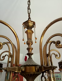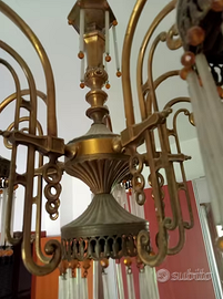 Causa trasloco e mancanza di spazio, vendo questo lampadario vintage, in stile Liberty, anni 60, a cascata, in metallo dorato, pendenti in vetro e perle color ambra. Manca un solo pendente in alto. In ottime condizioni, ha solo bisogno di una bella pulita. Ritiro entro settembre 2025.
