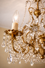 Elegante lampadario vintage in stile classico Maria Teresa, realizzato con struttura in metallo dorato e ricca decorazione di pendenti e catene in cristallo. Il design a bracci curvi con finiture floreali dona grande raffinatezza e luce all’ambiente. Dotato di 6 punti luce, è ideale per soggiorno, sala da pranzo o ambienti dallo stile classico ed elegante. Il gioco di riflessi dei cristalli crea un’atmosfera calda e scenografica. Buone condizioni generali, completo e funzionante.