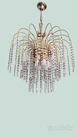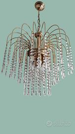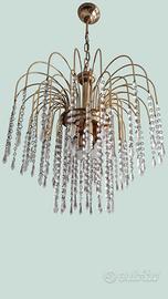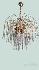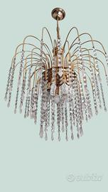 Lampadario vintage a sospensione in metallo dorato con decorazioni in cristallo. Il design elegante unisce uno stile classico a linee moderne, bracci arcuati creano un effetto scenografico “a cascata”, arricchito da fili di cristalli e pendenti a goccia che riflettono la luce in modo raffinato. Perfetto per arredare salotti, sale da pranzo o ingressi importanti, dona luminosità e un tocco di lusso all’ambiente. Buono lo stato di conservazione.