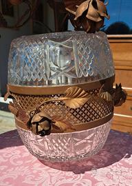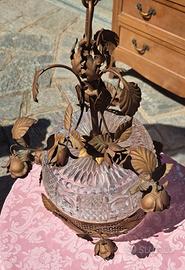 Elegante lampadario Art Déco composto da una boule in vetro pressato arricchita da uno splendido ramage di foglie e roselline che nasce su una fascia centrale e si allunga fino alla catena, splendidamente arricciato e curvato tanto da rendere i fiori quasi reali. Un oggetto di alta qualità, conservato egregiamente ed in ottime condizioni.