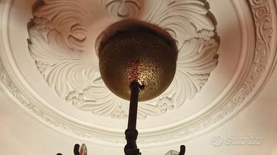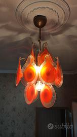 Il lampadario è caratterizzato da una struttura centrale in metallo a cui sono agganciati molteplici diffusori in vetro artistico pesante, lavorati a mano con una raffinata tecnica a "goccia" o "petalo". Il colore è un vibrante rosso/arancio sfumato verso il trasparente, che crea un'illuminazione d'atmosfera calda e scenografica quando acceso (come visibile in foto).