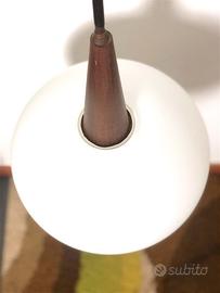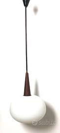 Elegante lampadario Vintage degli anni 60,caratterizzato da un design minimalista e raffinato in style Mid Century Modern. La struttura combina un elemento superiore in legno di Teak a cono,il diffusore è realizzato in vetro opalino bianco che dona una luce calda e diffusa,perfetto per creare un'atmosfera accogliente in ogni ambiente. La linea minimalista è un classico esempio dello stile Scandinavo,la forma affusolata del supporto superiore e il diffusore creano un equilibrio tra geometria e morbidezza visiva. CONDIZIONI PERFETTE Misure: Altezza vetro/cono cm 45 - Altezza totale cm 95 - Diametro lampada cm 28