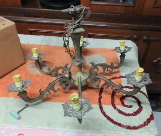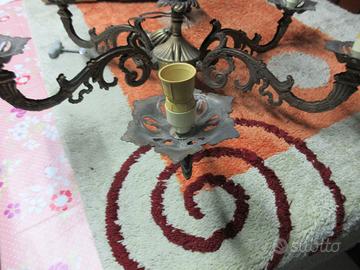 Lampadario in stile classico in metallo effetto bronzo anticato con decorazioni finemente lavorate.