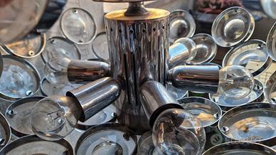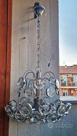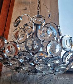Splendido lampadario di design anni 60/70 in stile Space Age, attribuibile nello stile e nella produzione a Gaetano Sciolari, con struttura in metallo cromato ed elementi decorativi lenticolari in vetro che creano riflessi e giochi di luce unici.