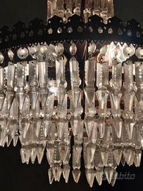 Lampadario Vintage con pendenti in vetro e cristallo a forma di prisma che rinfrangono la luce..