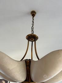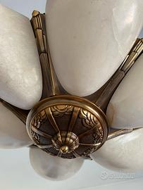 Lampadario vintage con una struttura in ottone e paralumi in vetro/alabastro, riconducibile allo stile Art Déco o Neoclassico.