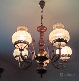 Questo bellissimo e raffinatissimo lampadario vintage è stato realizzato nel XX secolo ed è fatto in ottone, legno e vetro opalino trasparente, finissimamente lavorato, ed è in possesso della nostra famiglia ormai non so più da quanto tempo...