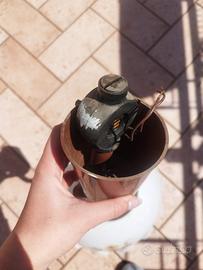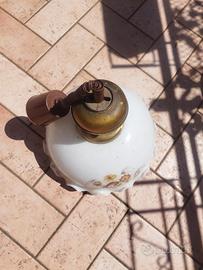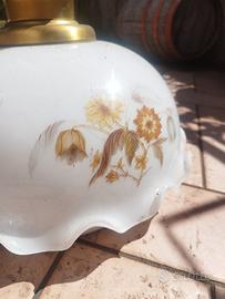 ottime condizioni Lampadario vintage in stile classico, perfetto per aggiungere un tocco elegante e retrò a qualsiasi ambiente. La struttura presenta un raffinato elemento centrale in metallo color ottone, abbinato a un diffusore in vetro opalino bianco decorato con delicati motivi floreali sui toni caldi del giallo e dell’oro. Il bordo ondulato del paralume dona ulteriore charme, mentre il portalampada con cavo flessibile permette un’installazione pratica. Ideale per cucina, soggiorno o sala da pranzo, si integra bene sia in ambienti rustici che vintage.