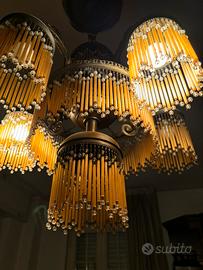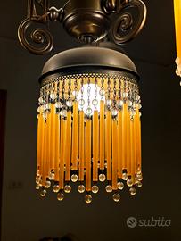 Bellissimo lampadario in stile vintage/classico, composto da 5 punti luce con paralumi impreziositi da frange color ambra e perline trasparenti decorative.