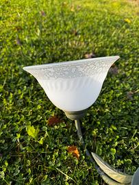 Lampadario vintage a cinque bracci in legno e ferro battuto completo di paralumi in vetro satinato.