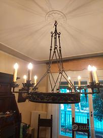 Lampadario vintage in metallo e legno lavorato a mano, per salotto stile rustico o rinascimentale. Diametro totale 126 cm