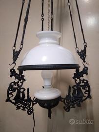 lampadario vintage in metallo e vetro opalino