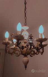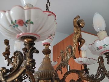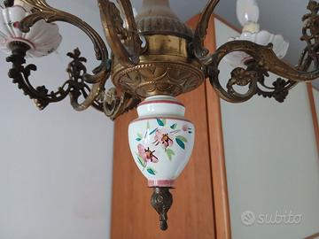 Lampadario Vintage in ottone a sei luciin stile classico, caratterizzato da elementi decorativi in porcellana o ceramica bianca dipinti con motivi floreali rosa e rossi. Materiali:Fusione di ottone con finitura invecchiata e dettagli in ceramica. Design:Presenta bracci sagomati decorati con motivi botanici e fige di putti in ottone, sormontati da piattini porta-lampadina in ceramica dipinta. Stile:Elemento distintivo dello stile Classico/Barocco oshabby chic, ideale per ambienti dal gusto tradizionale. Lavorazione Artigianale. Lo posso spedire, ma sarebbe preferibile il ritiro diretto in luogo, a Firenze.