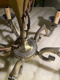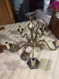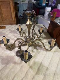 lampadario in stile classico, in ottone. Ha cinque bracci curvi con portalampade che imitano l’aspetto delle candele, completi di finte colature di cera per un effetto antico. Il corpo centrale presenta decorazioni incise e dettagli lavorati, tipici degli arredi tradizionali o vintage. Potrebbe risalire alla metà del Novecento, anche se lo stile richiama epoche precedenti