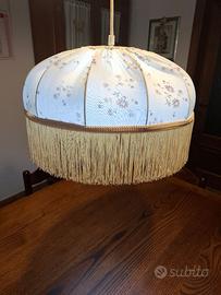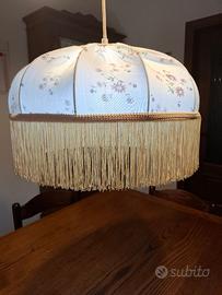 Lampadario a sospensione in stoffa dai colori neutri e in stile vintage. Effetto caldo e accogliente. Adatto ad ambienti quali camerette da bambina e studi. Perfettamente funzionante.