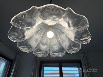 Splendido lampadario a sospensione in autentico vetro di Murano, risalente agli anni '70. Il diffusore presenta una raffinata lavorazione a petali (o "a tulipano") in vetro artistico con effetto ghiaccio/granigliato, che crea una diffusione della luce calda e suggestiva.