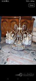 Lampadario vintage con struttura a bracci in metallo color oro, decorato con pendenti trasparenti e viola. Ottime condizioni, funzionante. #lampadario #lampadariovintage #lampadariopendenti