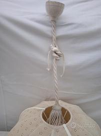 Fine e romantico lampadario vintage usato, di manifattura completamente artigianale, collocabile fra gli anni 50, 60 e gli anni 70 del 1900- in rinomato pizzo Sangallo, con base dei fiorellini in cotone : fiorellini a cinque petali tipici di questo pizzo. Il lampadario ha asta e pomello di attacco al soffitto in corda intrecciata. Il lampadario è di tinta ecrù e bianco, a mio avviso adatto a cameretta dei bambini, bagno, ufficio, salotto o per illuminare scrittoi o scrivanie, anche in posizione angolare. Il lampadario e' stato da me pulito e ricondizionato ed e' in ottime condizioni. Pochi pezzi di questo lampadario sono in circolazione. La circonferenza della base è di circa 129,5 cm, mentre la lunghezza della corda è di circa 49 cm + le frange del drappo. Per questo lotto utilizzerò packing adeguato e spedizione con corriere di fiducia. Offro spedizione gratuita compresa nel prezzo ed imballo adeguato.