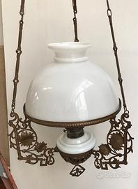 Lampada a sospensione databile alla fine dell’800 inizio 900 in ottime condizioni nonostante l’età. Il vetro del cappuccio come l’ampolla porta lampada sono in perfette condizioni senza rotture. I materiali oltre al vetro opalino sono bronzo e zama.