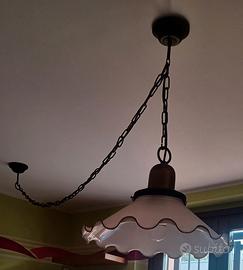 Lampadario vintage per cucina in vetro e ottone - diametro cm 45, fornito con 2 coppe e catena in ferro brunito per eventuale spostamento del punto luce. Attacco per lampadina E27 (non fornita). Ritiro in loco.