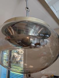 Meraviglioso lampadario vintage, struttura in alluminio con sfera in vetro ambrato. La sfera misura diametro 48 cm, altezza 30 cm. L'altezza della lampada (sfera vetro +copertura alluminio+ catena) cm 90. La parte superiore in alluminio ha delle piccole ossidazioni come da dettaglio foto. anche consegna a mano (preferibile).