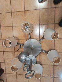 Lampadario vintage con 6 bracci, struttura in metallo finitura argentata cromata, i paralumi sono in tessuto di colore beige chiaro,