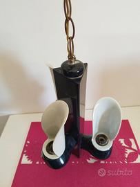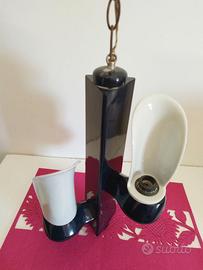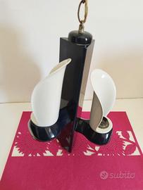 Consegna a mano ,non spedisco Splendido lampadario a sospensione vintage, originale degli anni '70, in fine ceramica smaltata. Il design è caratterizzato da un corpo centrale a sezione triangolare in nero lucido, dal quale si diramano tre bracci che sorreggono diffusori bianchi dalla forma organica e avvolgente, che ricorda il fiore della calla. Materiale: Ceramica smaltata di alta qualità. Colori: Contrasto elegante tra blue profondo e bianco latte. Include catena e rosone coprifili originale in ceramica coordinata. Dimensioni: Ideale come punto luce centrale per un salotto o una sala da pranzo dal gusto retrò.