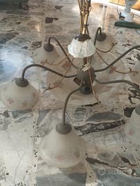 Questo oggetto è un lampadario a sospensione con struttura in metallo e paralumi in vetro, caratterizzato da un design rustico o classico con decorazioni floreali. Tipo: Lampadario a sospensione / Lampada da soffitto. Materiali: Metallo bronzato/marrone e vetro opaco decorato. Stile: Rustico, classico o provenzale. Funzionalità: Illuminazione d'interni, solitamente per sala da pranzo o soggiorno. Il lampadario è funzionante e si presenta in buone condizioni, si possono mettere fino a 9 lampadine. Il ritiro è possibile esclusivamente di persona e la zona è castel san Giorgio (sa)