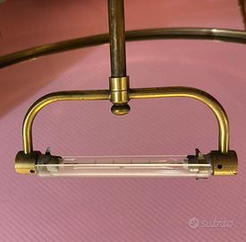 La struttura portante presenta bracci curvi e lavorati in ottone e metallo brunito, tipici di uno stile che mescola elementi neoclassici e industrial. Il vetro satinato della coppa serve a diffondere la luce in modo morbido e uniforme.