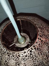 Elegante lampadario in metallo traforato, color rame. Design moderno con effetto luminoso decorativo grazie ai fori che creano giochi di luce suggestivi. Ideale per salotto, cucina o ambienti in stile industriale o contemporaneo.