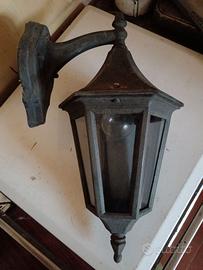 Lampada da parete in metallo e vetro da esterno colore nero cm 45 x 25 usata. Num. 8 più n. 2 lampioncini da terra altezza cm 120 più n. 1 sospeso. Prezzo a pezzo singolo 15 euro, vendibili singolarmente